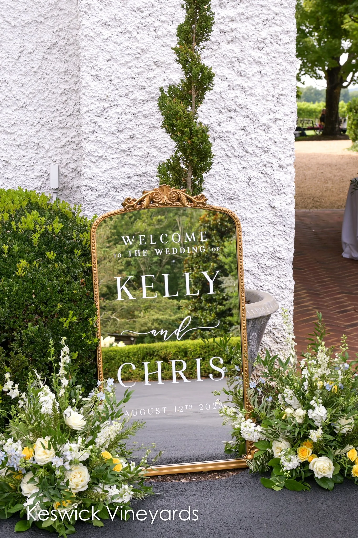 Congratulations to Kelly and Christopher, who were married at Keswick Vineyards on Saturday, August 12th, 2023. Having their outdoor wedding in the month of August in Virginia, Kelly & Chris chose Keswick’s “shade” location for their ceremony. As you can see, the beauty of Keswick’s iconic fountain was still showcased behind the couple so they could magically have that fountain go off at their first kiss. It’s those little things that we do at Keswick Vineyards that make our weddings extra special and personal.