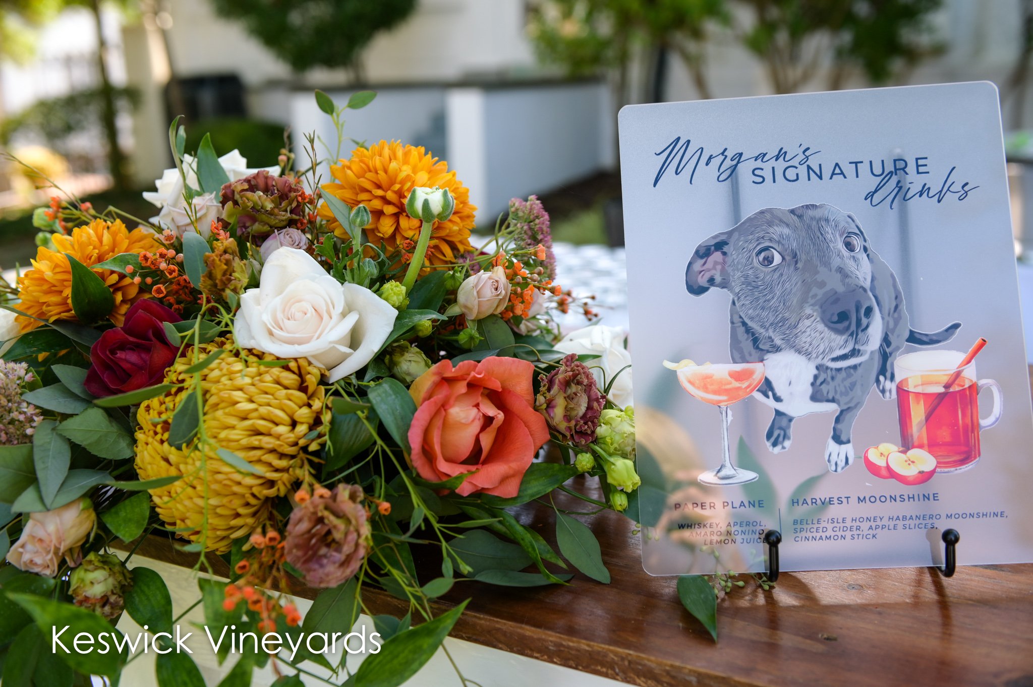 Cocktail hour took place beneath the grand canopy of a 300-year-old oak tree on the East Lawn of Edgewood Estate. The bar featured an adorable sign of their drink options, complete with an illustration of their beloved dog, adding a personal touch. Guests then found their name cards, each propped up by decorative wine corks, seamlessly blending into the vineyard vibe.